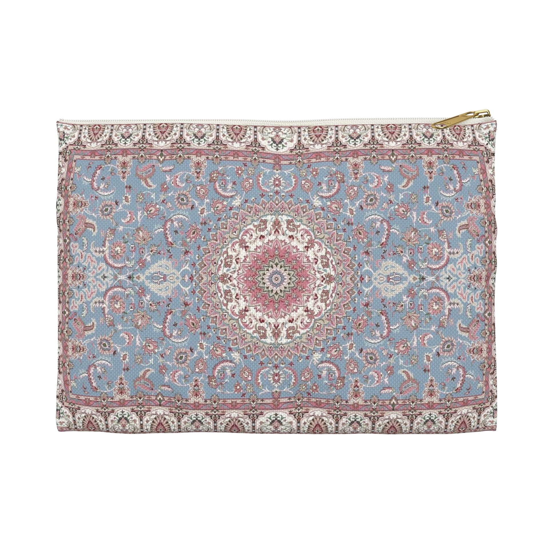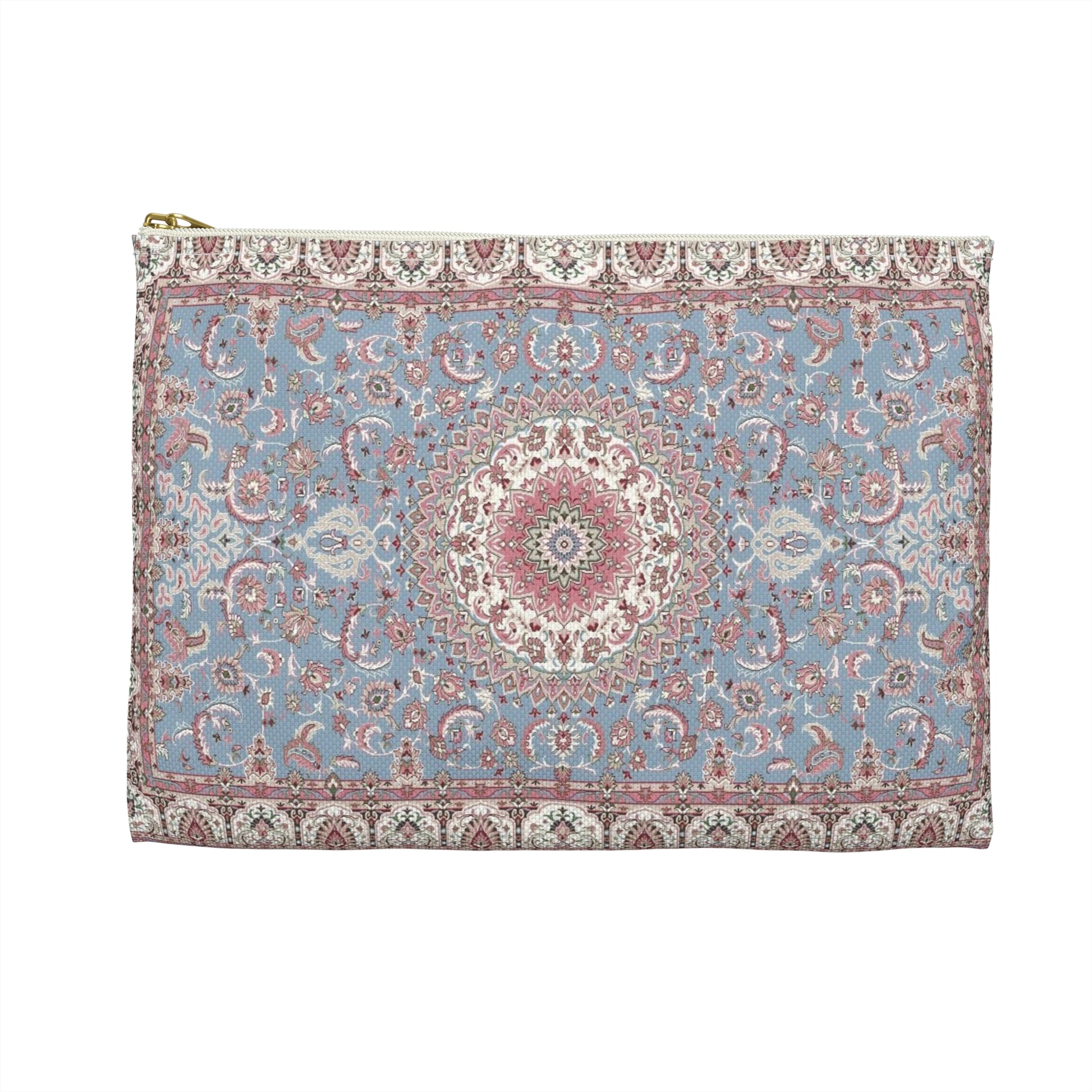 A versatile pouch featuring a classic medallion tapestry design in soft blue and rose tones. Made with durable canvas and finished with a gold zipper, it’s ideal for everyday essentials such as makeup, stationery, or travel items.