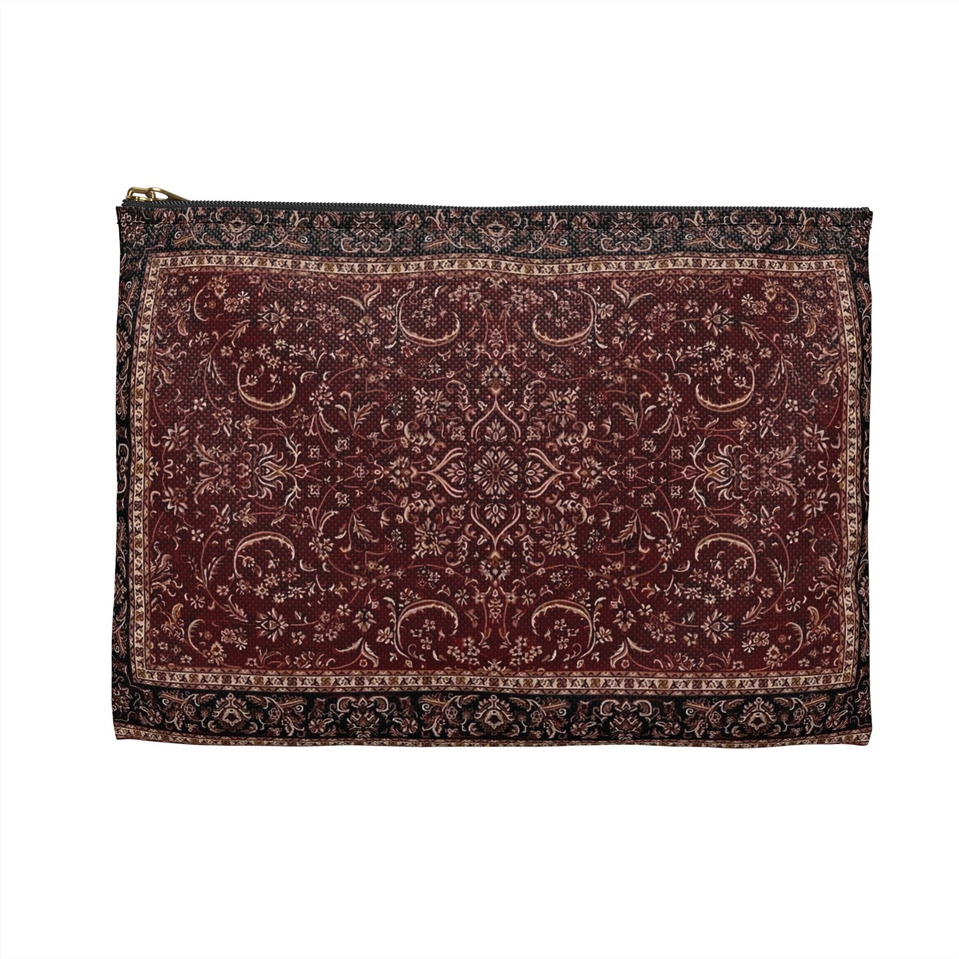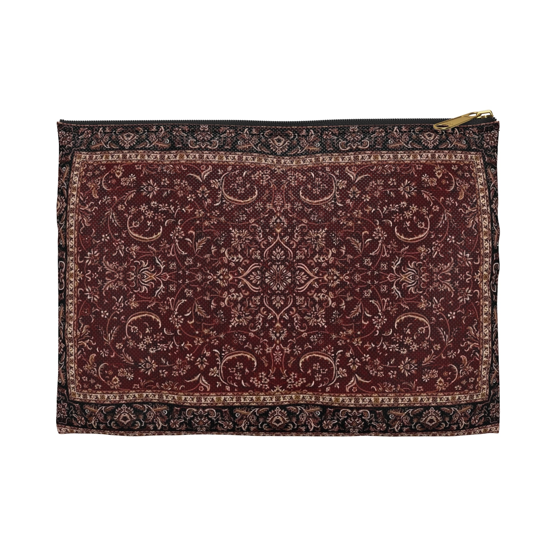 A versatile pouch featuring a tapestry design in deep red with subtle floral detailing and a dark border. Made with durable canvas and finished with a gold zipper, it’s perfect for everyday essentials such as makeup, stationery, or travel items.