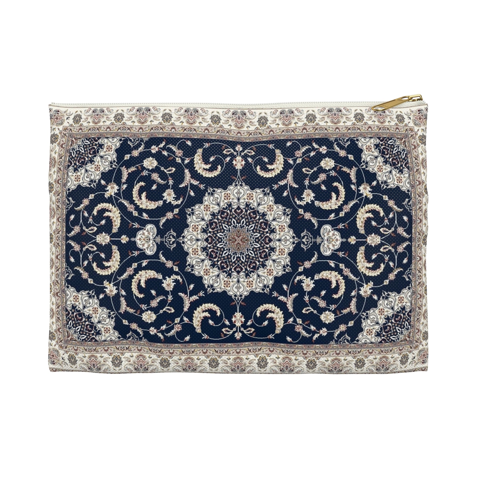 A versatile pouch featuring a detailed tapestry design in navy and cream tones. Made with durable canvas and finished with a golden zipper, it's perfect for everyday essentials such as makeup, stationary, or travel items.