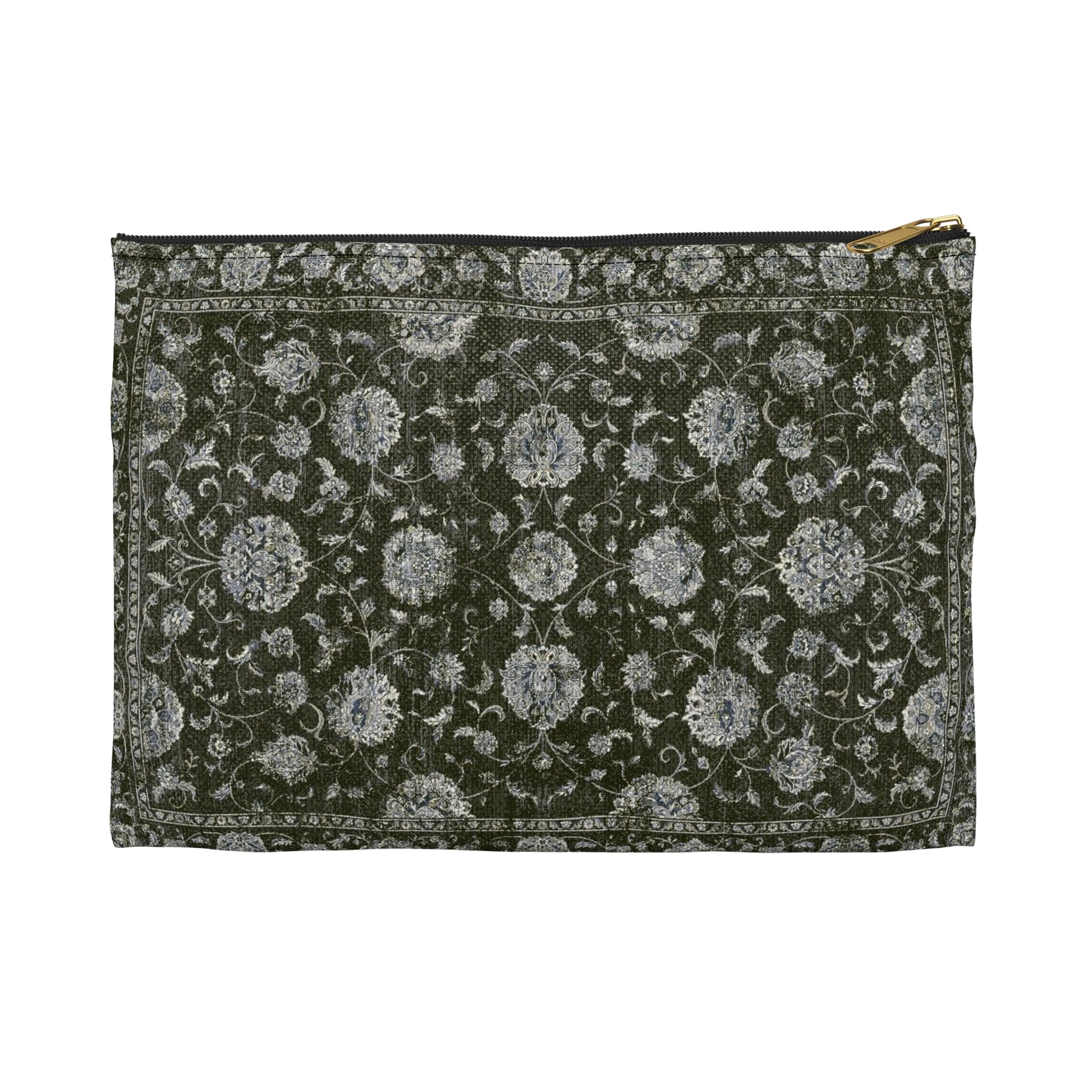 A versatile pouch featuring a floral tapestry design in a dark green with subtle floral detailing. Made with durable canvas and finished with a gold zipper, it’s perfect for everyday essentials such as makeup, stationery, or travel items.