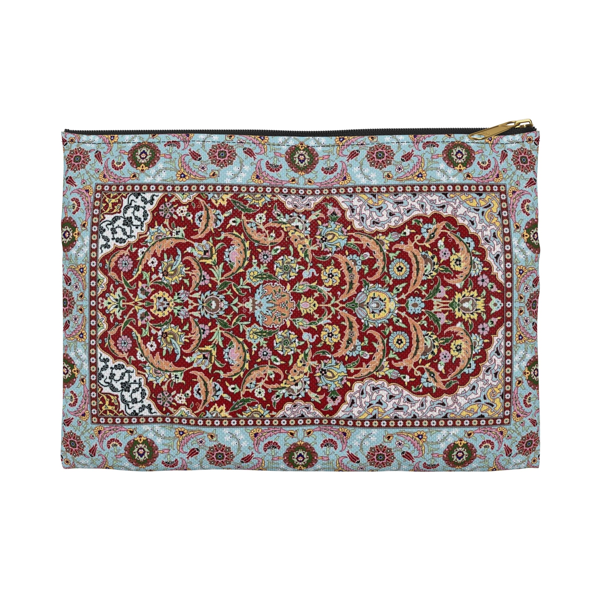 A versatile pouch featuring an all-over Persian floral tapestry design in rich red, gold, and sky-blue tones. Made with durable canvas and finished with a gold zipper, it’s perfect for everyday essentials such as makeup, stationery, or travel items.